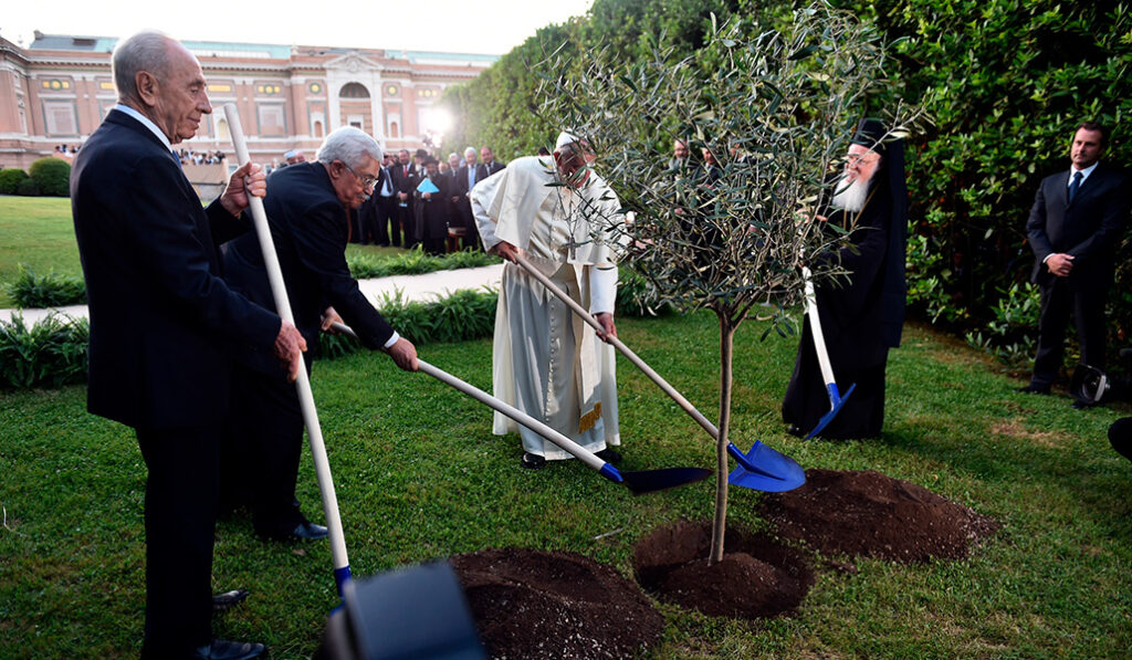 El Papa Francisco, Shimon Peres, Mahmud Abás y el patriarca Bartolomé plantaron entre todos un olivo por la paz en el Vaticano. Más de diez años después, la guerra en Tierra Santa aún no ha terminado.