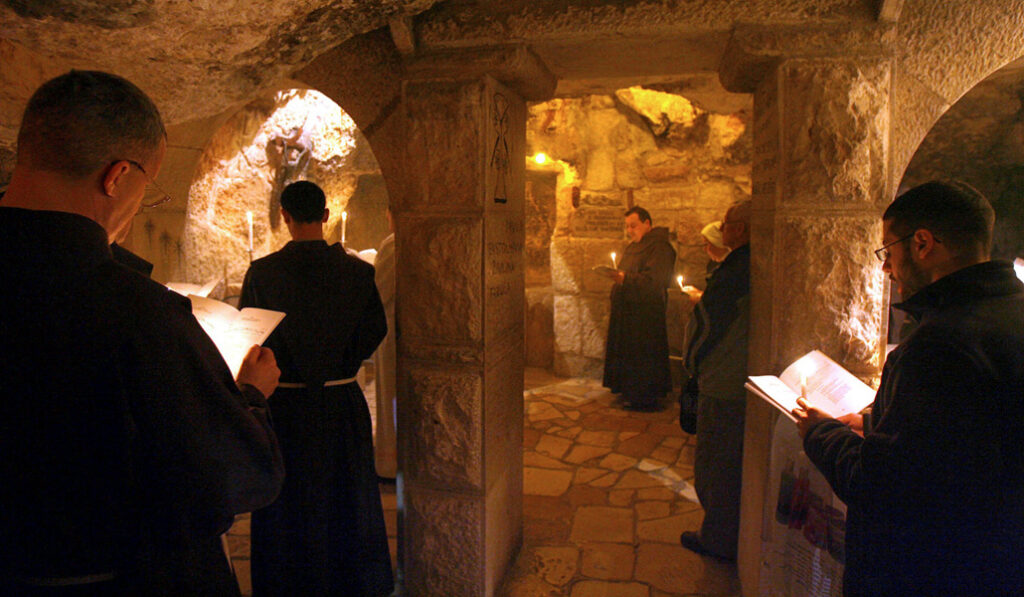 Franciscanos de Belén oran, durante la Navidad de 2006, en la Gruta de San Jerónimo, junto a la basílica de la Natividad.