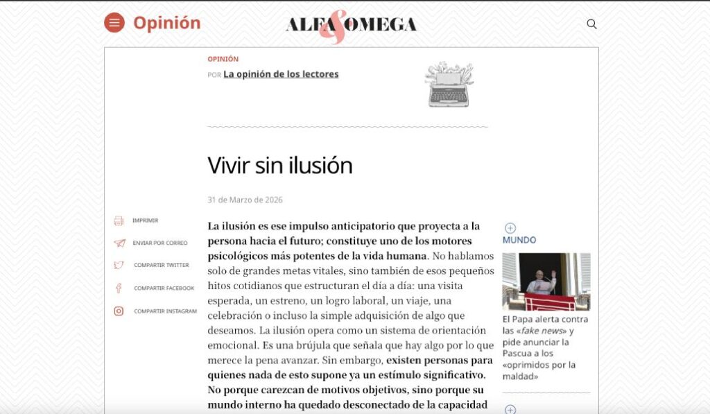 La primera carta es de Rocío López, profesora en la Universidad CEU Cardenal Herrera, sobre Vivir sin ilusión. Pueden enviarse al correo redaccion@alfayomega.es