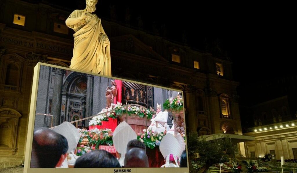 La luz llegó progresivamente desde la oscuridad en una basílica de San Pedro llena con 6.000 personas (y otras 4.000 que la siguieron desde las pantallas en la plaza de San Pedro), la luz «que nos ha unido en la Iglesia como lámparas para el mundo», como dijo el Papa en la homilía.