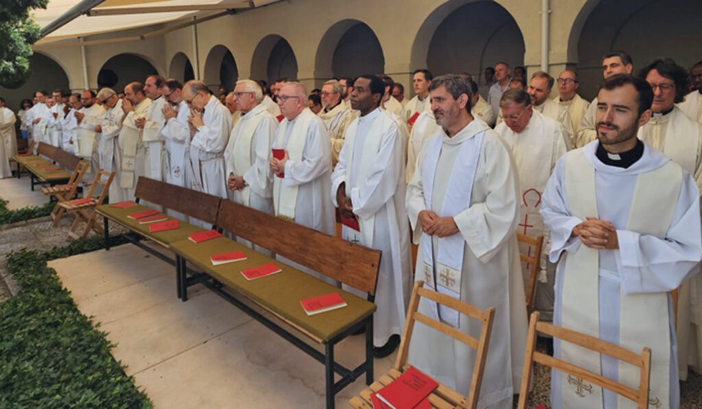El claustro del monasterio de las Oblatas de Cristo Sacerdote, en Ciudad Lineal, ha acogido un año más, como viene siendo tradicional, la Misa de Jesucristo, Sumo y Eterno Sacerdote, presidida por el cardenal José Cobo, arzobispo de Madrid. A estas religiosas que entregan su vida en oblación por los sacerdotes se ha referido el cardenal Cobo en su homilía: «Nos sentimos privilegiados por estar acompañados por la oración y la ofrenda de vuestra comunidad». «Nos sentimos —ha añadido— agradecidos y deudores; solo Jesús, el Eterno Sacerdote, os podrá pagar esta vida entregada que nos amasa juntos».