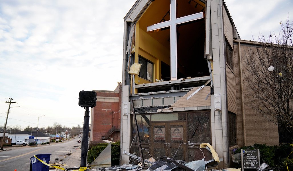 Iglesia afectada por el paso de uno de los tornados en Mayfield. Foto: CNS / Reuters.
