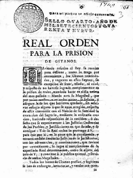 Aquel año el marqués de la Ensenada, Zenón Somodevilla, y el arzobispo de Oviedo, Gaspar Vázquez, miembros del Consejo de Castilla, firmaron la Real Orden para la Prisión de Gitanos. Que se llegara a esta situación, según el experto, «tiene que ver con el doctor, teólogo y filósofo Sancho de Moncada», quien, «en 1619, desarrolló un memorial económico para mejorar la economía nacional». En él, «proponía la expulsión total de los gitanos para lograr este fin».