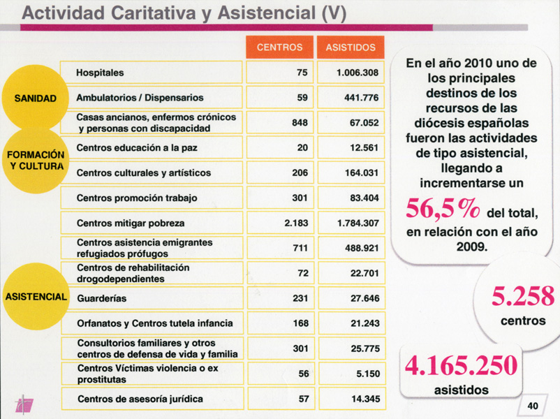 Según los datos de la memoria, la Iglesia atiende en sus necesidades básicas a 4,1 millones de personas en España, una cifra que no ha dejado de aumentar en los últimos años y que creció, en 2010, casi un 15 % con respecto al año anterior; todo ello ha sido posible gracias a que la Iglesia ha incrementado su actividad asistencial en más de un 56 %. De este modo, se pueden atender 134 hospitales y ambulatorios, 848 residencias de ancianos y enfermos, 168 orfanatos, más de 300 centros de defensa de la familia y de la vida, 56 centros de atención a víctimas de la violencia familiar y de la prostitución, 711 orientados a la ayuda a inmigrantes, y 2.183 centros destinados a mitigar la pobreza en España, entre otros. En total, son 5.258 centros, que asisten a más de 4 millones de personas.