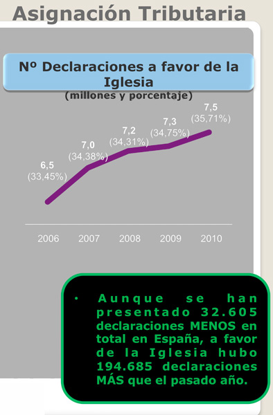 El segundo factor a tener en cuenta es que la confianza en la labor de la Iglesia sigue creciendo: de hecho, las asignaciones a favor de la Iglesia católica hayan aumentado en casi 200.000: en números redondos, 9,2 millones de contribuyentes, teniendo en cuenta las Declaraciones conjuntas, marcaron la X a favor de la Iglesia católica.