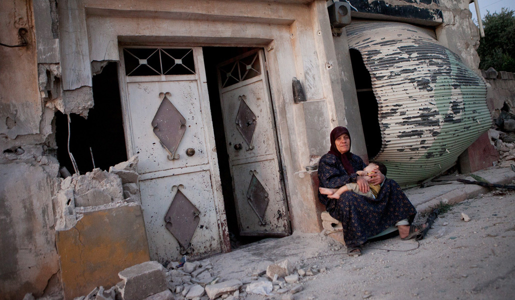 Esta mujer siria, sentada con su nieto a la puerta de su casa destrozada en el pueblo de Treimsa, llora la tragedia de sus gentes: dos centenares de personas, entre ellas muchos niños, mujeres y ancianos, fueron degollados, a sangre fría, ante la pasividad intolerable de los Organismos Internacionales. Siria vive en plena guerra civil, mientras los carros blindados recorren la capital, Damasco. El cínico Gobierno de Assad sigue hablando de terroristas, mientras los intelectuales del mundo libre escriben artículos sobre la doble moral y cosas parecidas. Entre tanto, la cifra de asesinados se acerca a los 20.000.