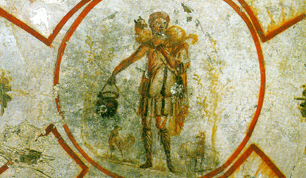 Imagen del Buen Pastor. Fresco en las Catacumbas de San Calixto, Roma.