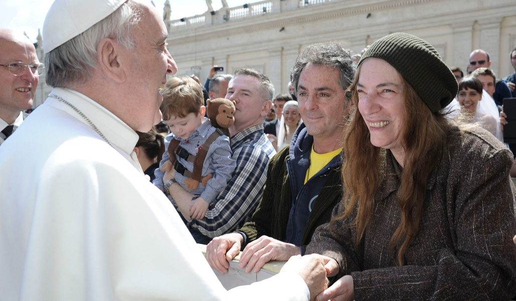 El Papa Francisco, desde que fue elegido sucesor de Pedro, el pasado 13 de marzo, ha saludado a muchos iconos de nuestro tiempo, desde políticos y deportistas hasta las personas más inesperadas, como Patti Smith, que con la edad de 66 años asistió a una de las Audiencias en la Plaza de San Pedro. Jamás ha dicho que fuese católica, pero desde que se enteró que Benedicto XVI abdicaba, rezó continuamente para que el próximo sucesor del apóstol san Pedro se llamase Francisco. Y parece que sus oraciones fueron escuchadas. «Me gusta mucho, me parece una persona muy interesante», afirmó la cantante sobre el Papa Bergoglio poco después de haberle saludado. Unos días después había un gran acontecimiento musical en Roma donde la cantante participaba, y les dedicó a Francisco y a su Papa favorito, Juan Pablo I, una canción.