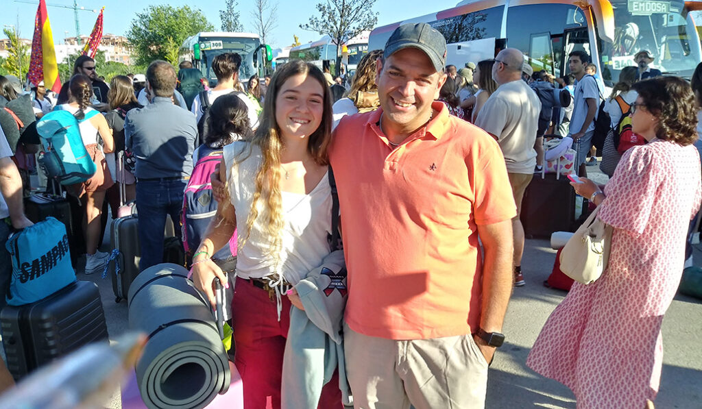 Hay padres que, en su caso, sí son conscientes de lo que vivirán sus hijos. María Dolores y Pablo han ido a despedir a su hija María Ángeles, de 16 años, de la parroquia San Germán. Ellos son de la Generación JMJ de san Juan Pablo II. «Te sientes Iglesia», cuenta la madre, «ves que somos un montón de jóvenes, y además, te lo pasas bien… ligas, estás agotado, pero es una experiencia de Dios preciosa».