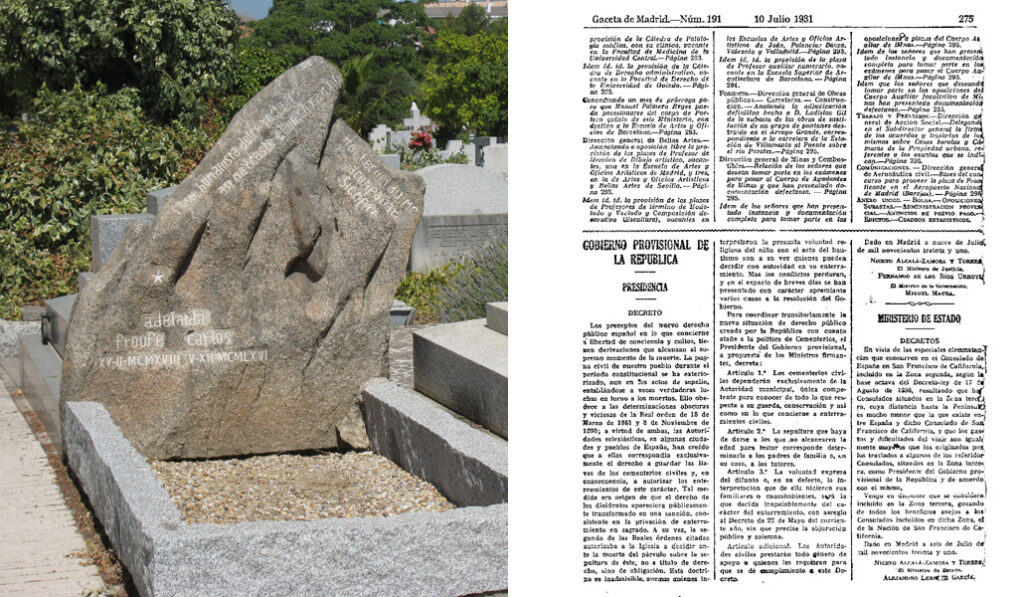 El ministro socialista de Justicia don Fernando de los Ríos hizo publicar, en Gaceta de Madrid, 10 de julio de 1931, un madrugador decreto sobre la secularización de los cementerios municipales de España. El artículo 27 de la Constitución declaraba los cementerios «sometidos exclusivamente a la jurisdicción civil», sin que pudiera haber en ellos «separación de recintos por motivos religiosos». El 4 de diciembre del mismo año, leía el mismo ministro, en las Cortes, el proyecto de ley