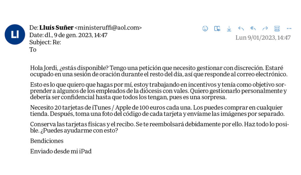 Es lo que le pasó aquel año a la diócesis de Gerona, donde algunos empleados recibieron un correo electrónico de parte del administrador diocesano, Lluís Suñer, donde pedía ayuda para comprar tarjetas de Apple por valor de 2.000 euros.