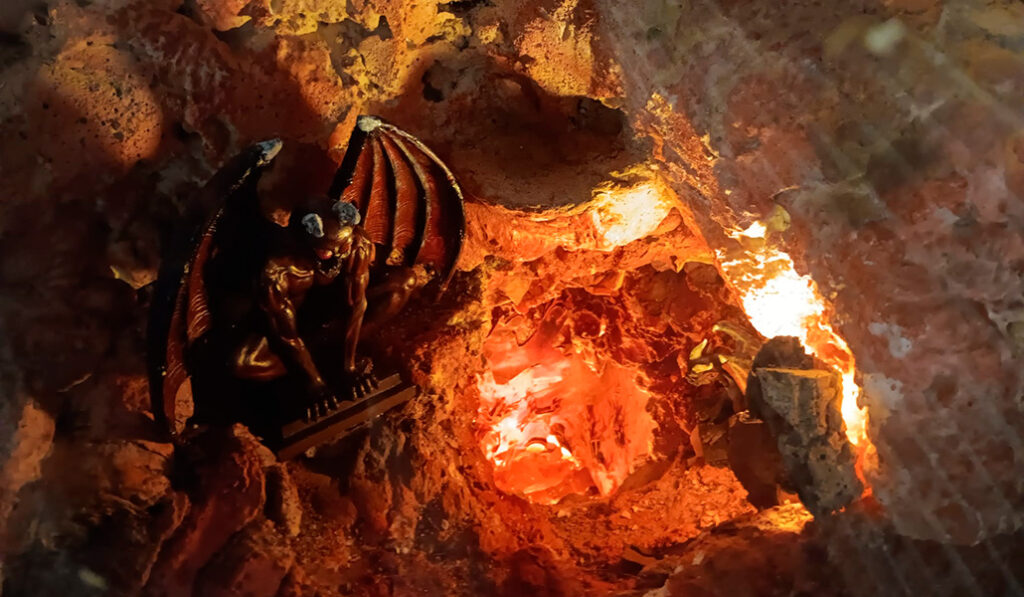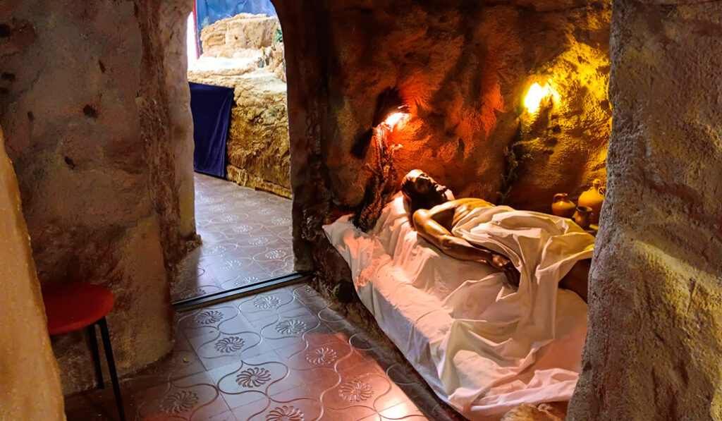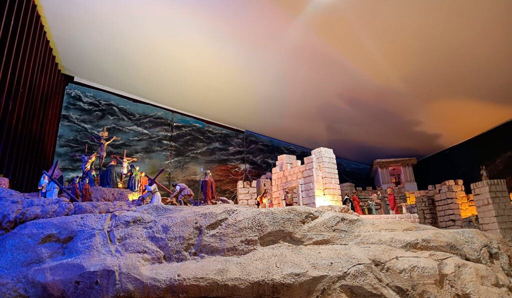 Ubicada en el mismo espacio en el que se pone el belén en Navidad —«se tunea» para la ocasión, refiere el sacerdote—, el montaje tiene una particularidad: una gruta que hace que la experiencia sea inmersiva.