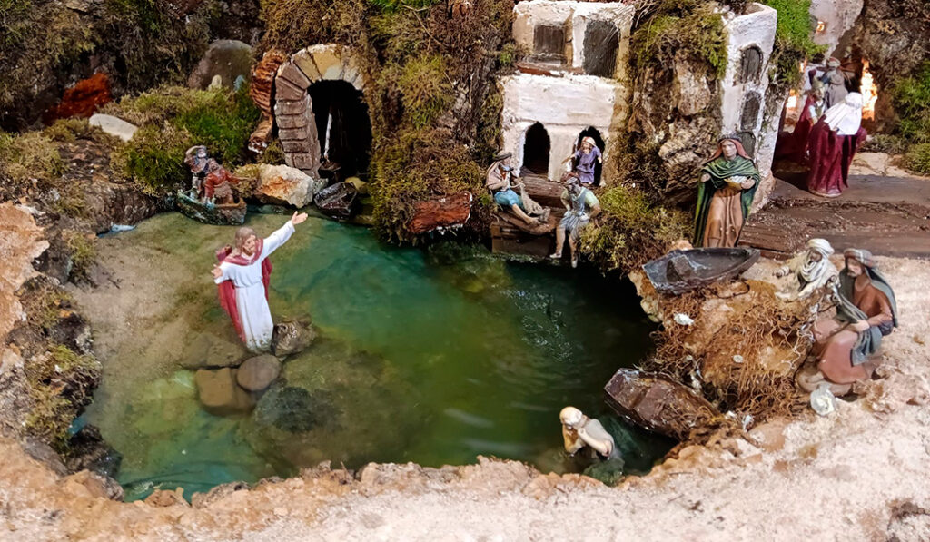 Por eso está el Jordán, con Jesús recibiendo el Bautismo, y el mar de Galilea, una escena con infinidad de detalles, como las barcas de los pescadores con las redes y caracolas atrapadas.