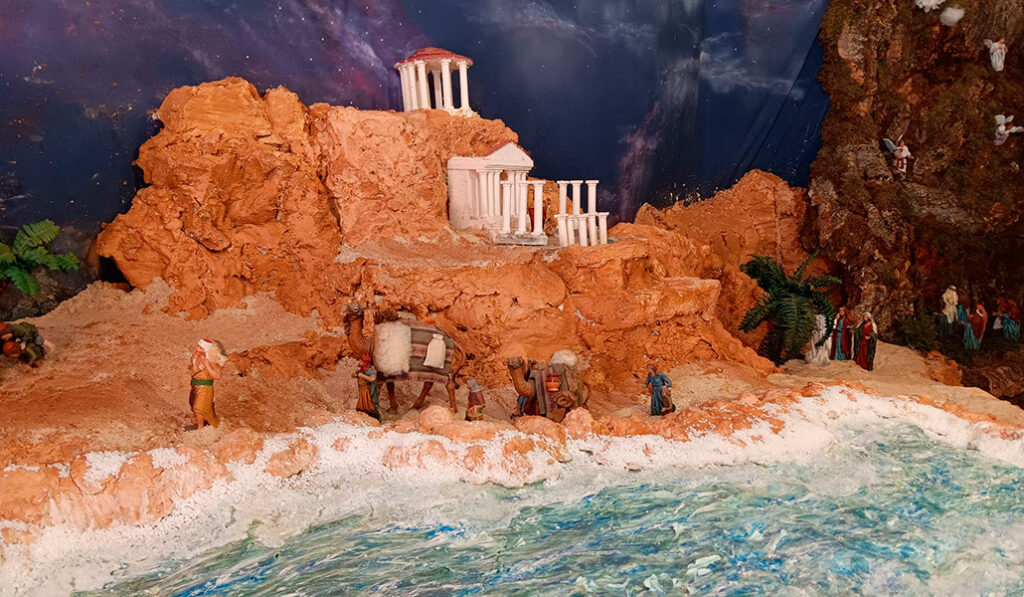 Es al pasar la cueva de la sepultura, que se abre a un espacio que da más juego para la creatividad. Así, este año por primera vez Mercedes ha recreado el Mar Muerto, pintado y con sal, que ha cristalizado, con lo que le da un mayor realismo. Además, ha incluido las cuevas del Qunrám, con sus manuscritos a la vista.