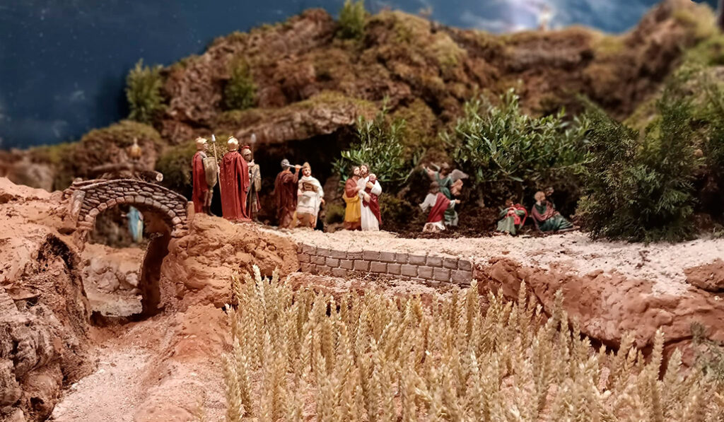 La propuesta de montaje es cada año distinta, pero siempre se trata de seguir los relatos evangélicos para encaminarlos hacia la Pasión. Hay elementos que se repiten, como la abundante presencia de agua —excepto en el torrente Cedrón, porque estaba seco—. Es marca de la casa. A Mercedes, que es quien monta tanto el Belén como la Pasión con la colaboración de Consuelo, le gusta siempre que haya agua.