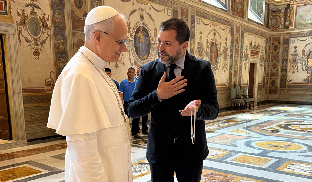 El propio artesano se la entregó personalmente al Papa el miércoles, colgándosela al cuello con emoción y reverencia. «El Papa, visiblemente conmovido, recibió con alegría este objeto que refuerza su vínculo con los santos y le recuerda la responsabilidad espiritual que asume como guía de la Iglesia», afirma la nota.