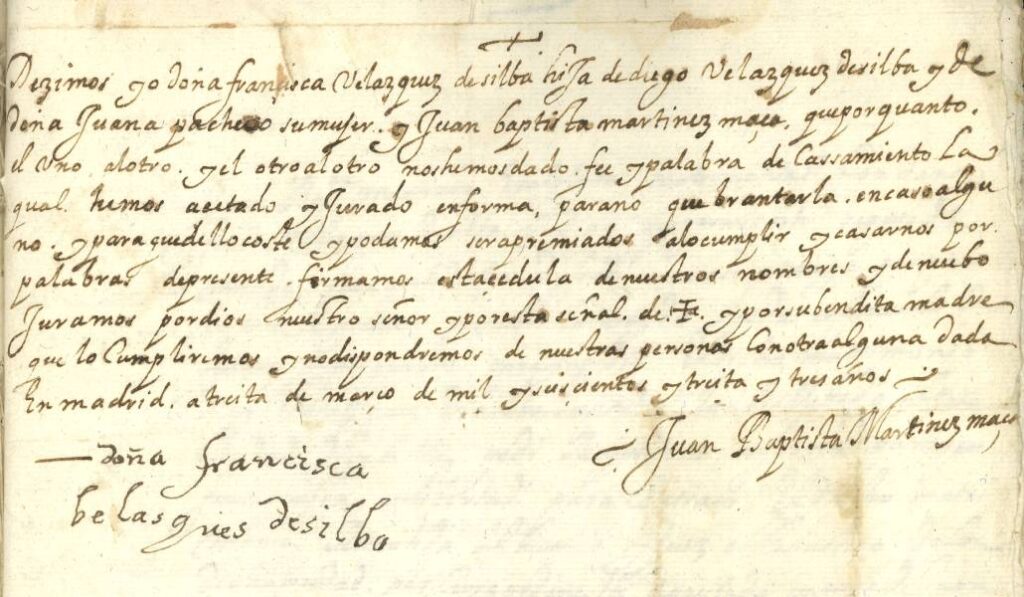 La historia, que ha sido dada a conocer en la revista Archivo Español de Arte gracias a los investigadores Patricia Manzano y Mario Zamora, cuenta el pleito que discurrió en Madrid y Sevilla entre el pintor Martínez del Mazo, discípulo de Velázquez, y la familia de su maestro. La disputa comenzó cuando Velázquez y su mujer se enteraron de que Juan Bautista y Francisca habían pasado un par de noches juntos y se habían comprometido en secreto. Ambos intentaron impedir que se produjera la boda y por ello enviaron a Francisca —entonces de apenas 14 años de edad— de Madrid a Sevilla, para que su abuelo Francisco Pacheco la protegiese.