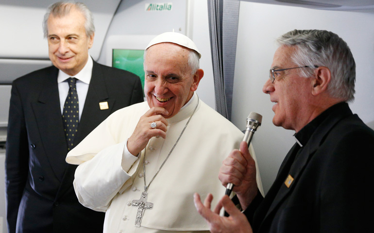 No hubo la habitual rueda de prensa en el avión rumbo a Río de Janeiro, pero el Papa visitó a los 70 informadores que le acompañarán durante todo el viaje, bromeó con ellos sobre su aversión a las entrevistas («no sois tan feroces», les dijo al final a del encuentro) y se detuvo a saludarlos uno a uno, sin prisa, durante una hora, preguntándoles por su familia, bendiciendo fotos y objetos religiosos… Además, el Pontífice les explicó una de las claves del mensaje que lleva a Río: viene a hablar a los jóvenes, pero no como un colectivo aislado de la sociedad, porque los jóvenes pertenecen «a una patria, a una cultura, a una fe…». Los jóvenes son el futuro de la sociedad, pero también los ancianos. «Un pueblo tiene futuro si va adelante con todos». Francisco expresó su preocupación tanto por los efectos de la crisis mundial en los jóvenes (corremos el riesgo de tener una generación que nunca ha tenido un trabajo), como por la «cultura del descarte» que margina a los ancianos. Ésta es la transcripción de las palabras del Papa facilitada por Radio Vaticano: