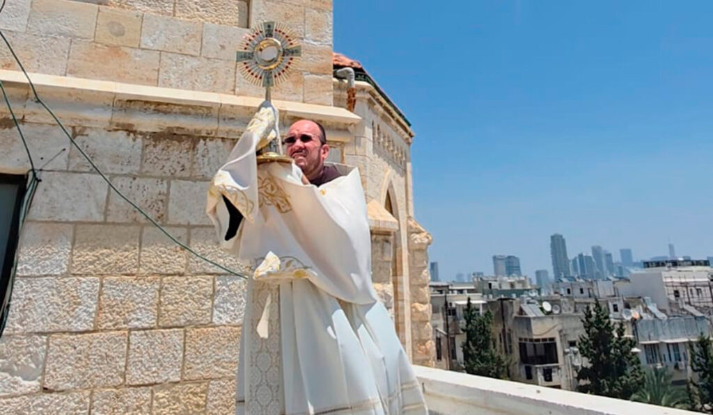 El plan para el pasado domingo de Agustín Pelayo, párroco de la comunidad franciscana de San Antonio en Bat Yam, al sur de Tel Aviv (Israel), era celebrar una peculiar procesión de Corpus Christi pasando por las casas de sus feligreses. Iba a sustituir a la Misa, pues sin refugio para protegerse en caso de un ataque con misiles no está permitido acoger a más de 30 personas. Pero no había suspendido la celebración solo por imperativo legal. El 19 de junio tomaron conciencia del «momento especialmente difícil» que vive Tierra Santa tras el inicio del conflicto con Irán y de la necesidad de extremar las precauciones: durante la Misa de la mañana, las sirenas interrumpieron la celebración. Tras oír desde el sótano un gran estruendo descubrieron que un misil iraní interceptado por el sistema de defensa había caído en la misma calle y causado daños en el convento. A caballo entre la precaución y el celo pastoral, había planeado el recorrido de la procesión en función de «dónde hay refugios».